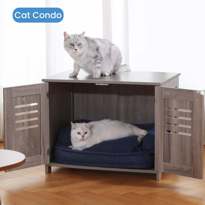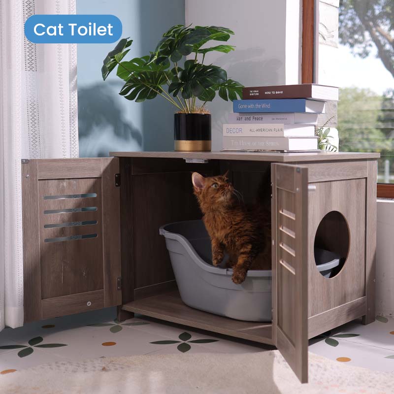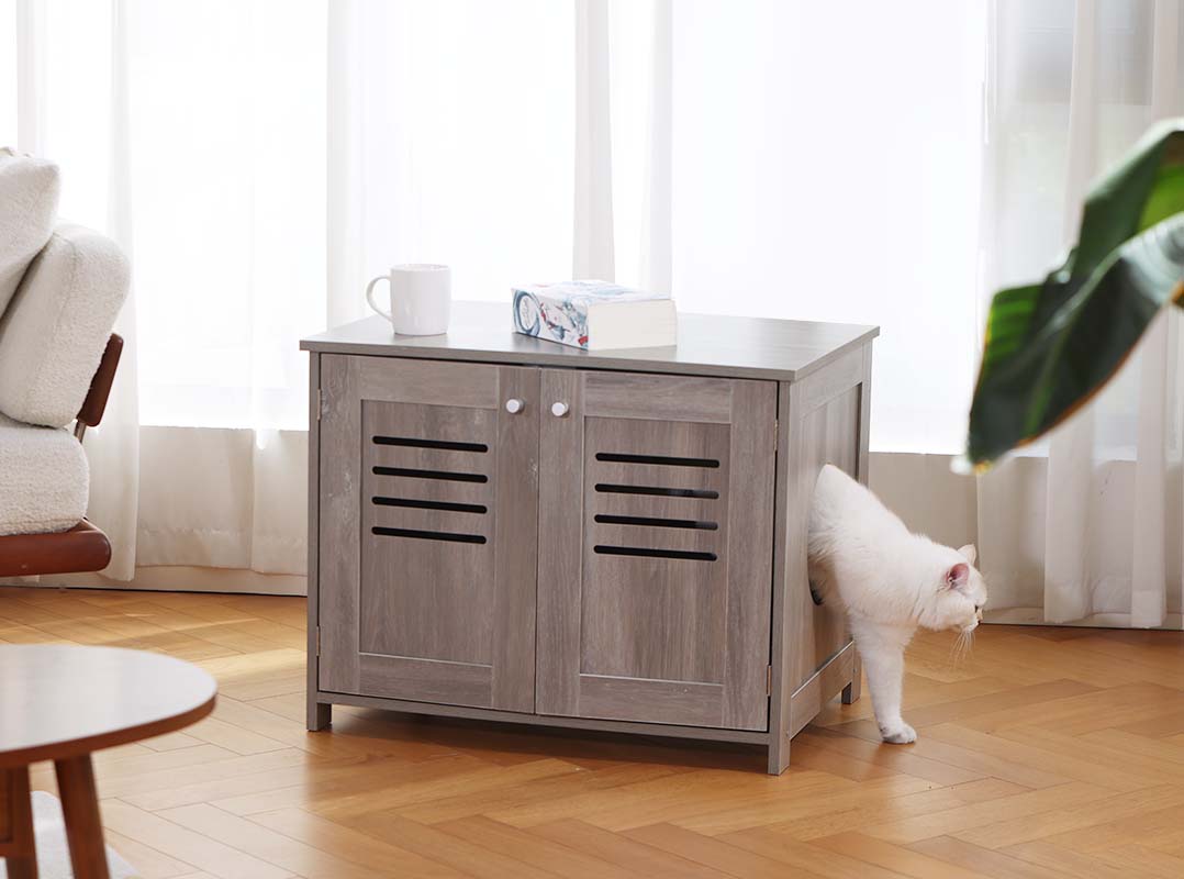- It serves as a cat litter box enclosure, a cat/dog house, and a cabinet for your home.