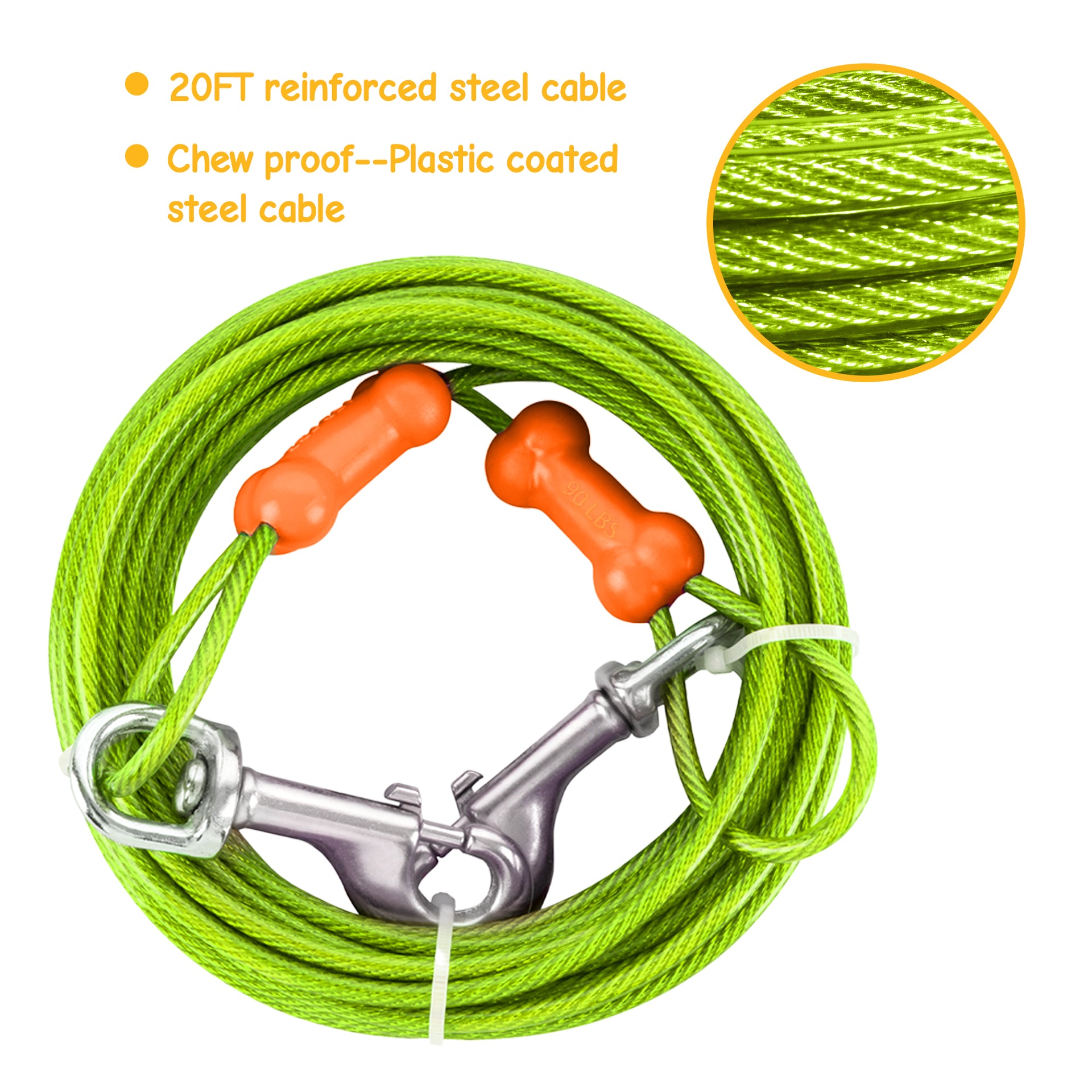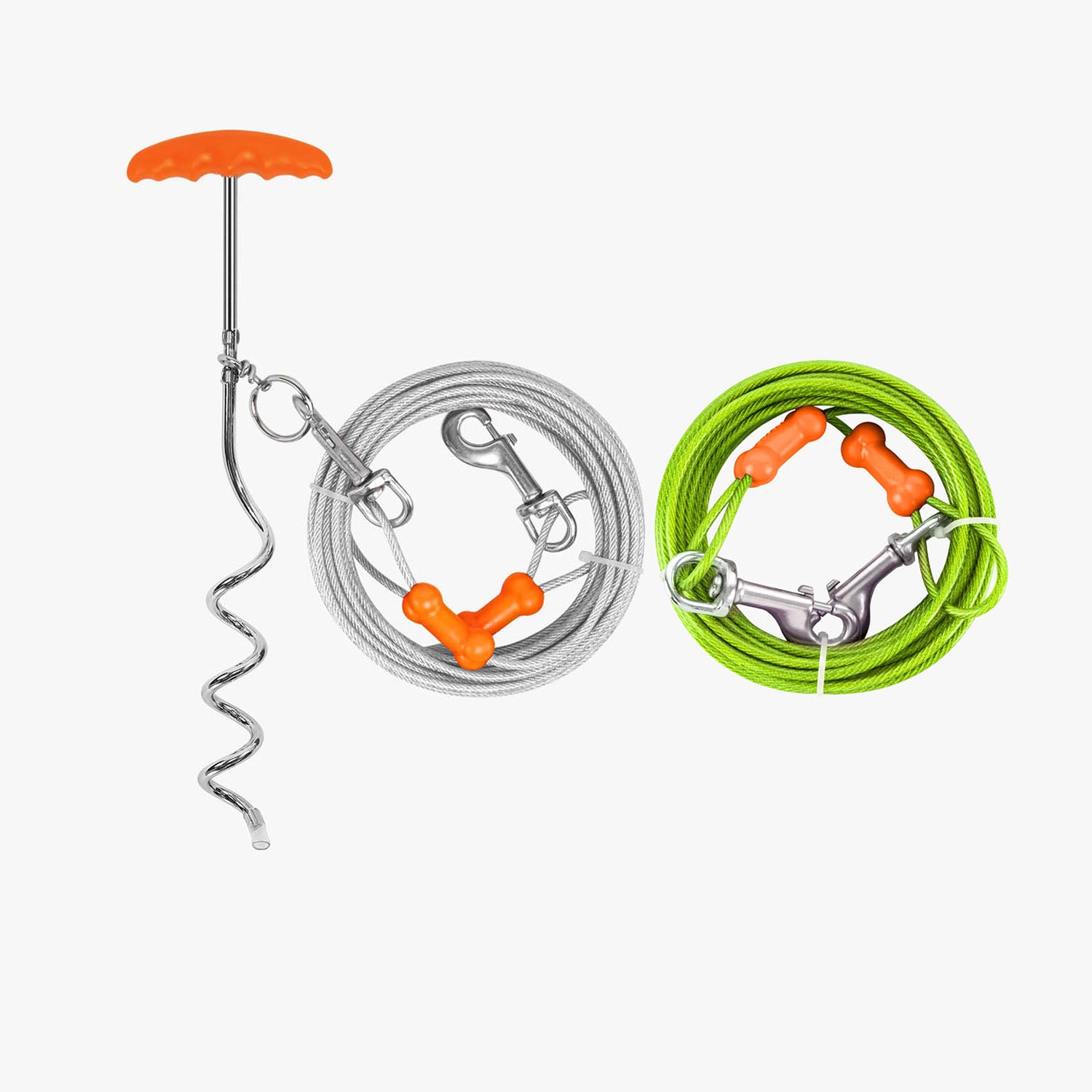 The product contained a stake and two cables. The grip handle helps you place the stake at the location you prefer at any time. The sturdy and durable reflective cable helps your dog easily be seen at night and provides plenty room for your dog to roam. The cables are 20 or 25 FT which fits for a medium to large size dog up to 90 Lbs. The steel is covered with vinyl and with designed bone ends to protect the steel from rust.