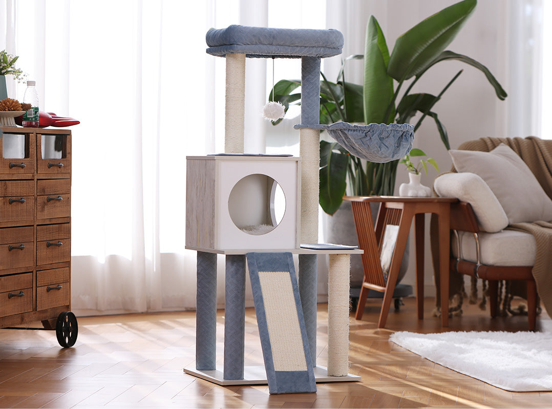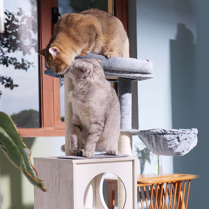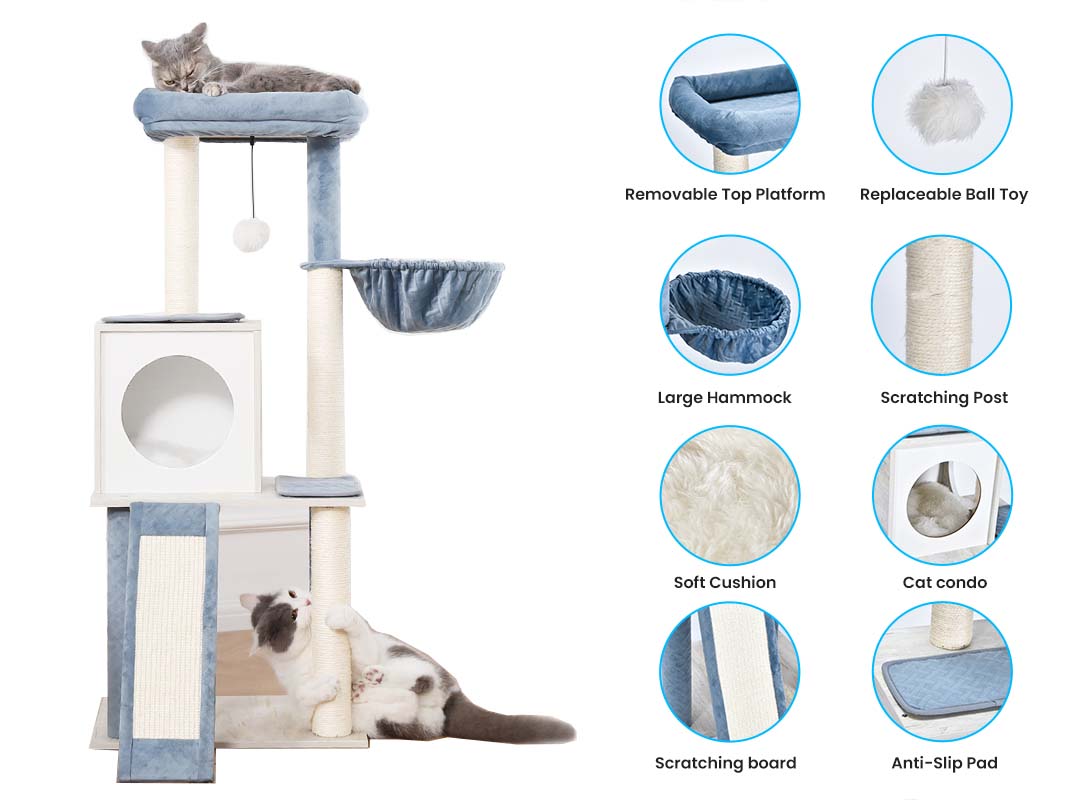 - A 5-tier multifunctional cat tree including a platform, a hammock, a condo, and a scratching board provides multiple function use for multiple cats to use at the same time.