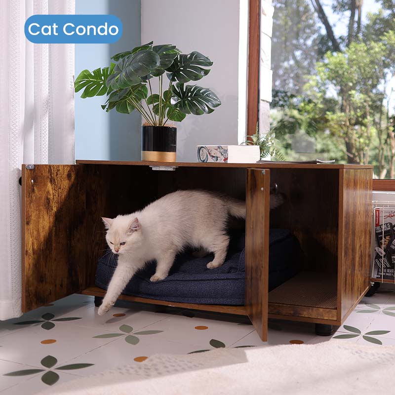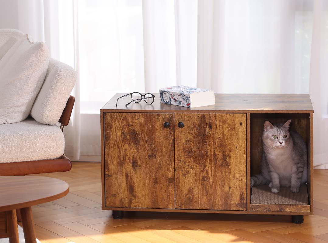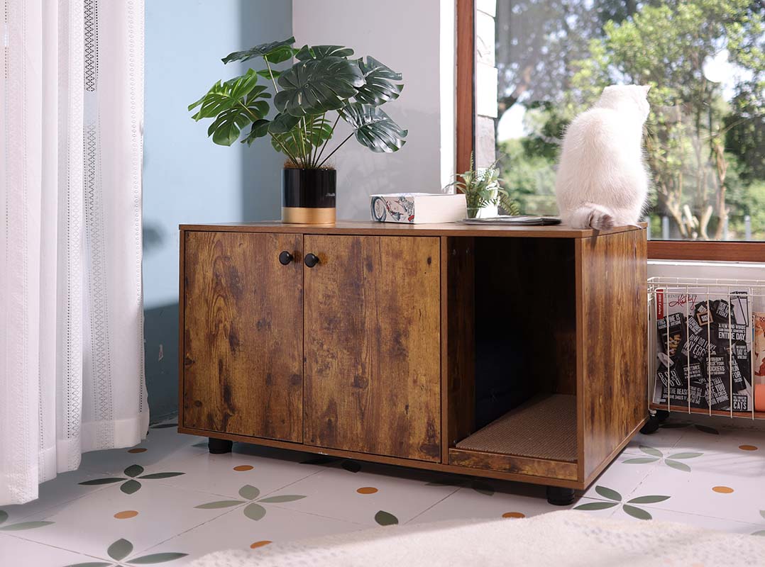 - It serves as a cat litter box enclosure, a cat/dog house, and an end table for your home.