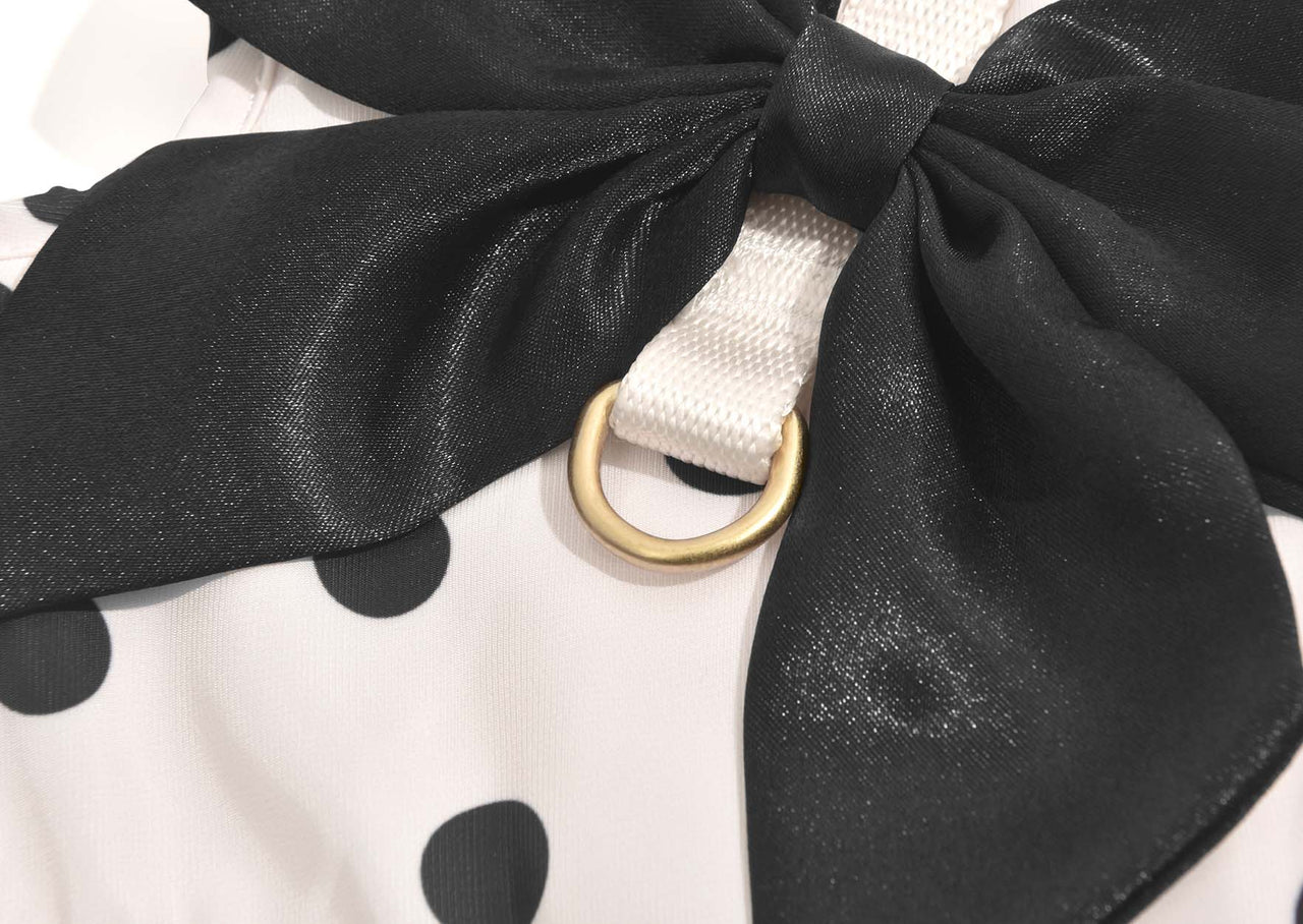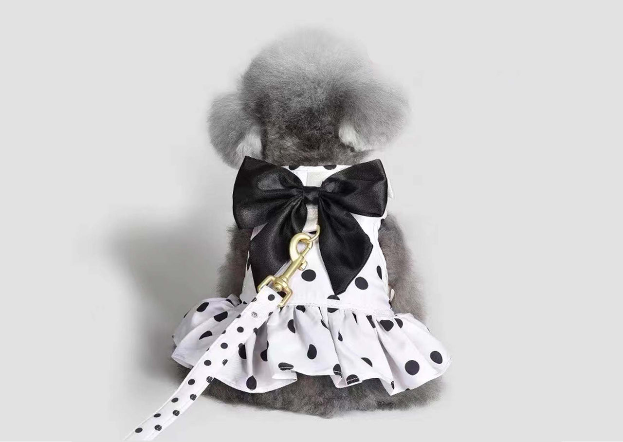 Polka dots never go out of style. The white and black polka dot pattern ruffled hemline and black bowknot make your dog the most remarkable baby on the street.