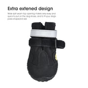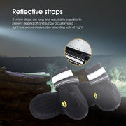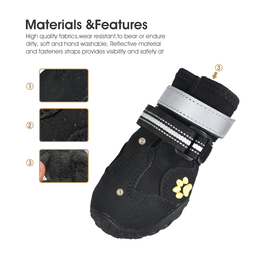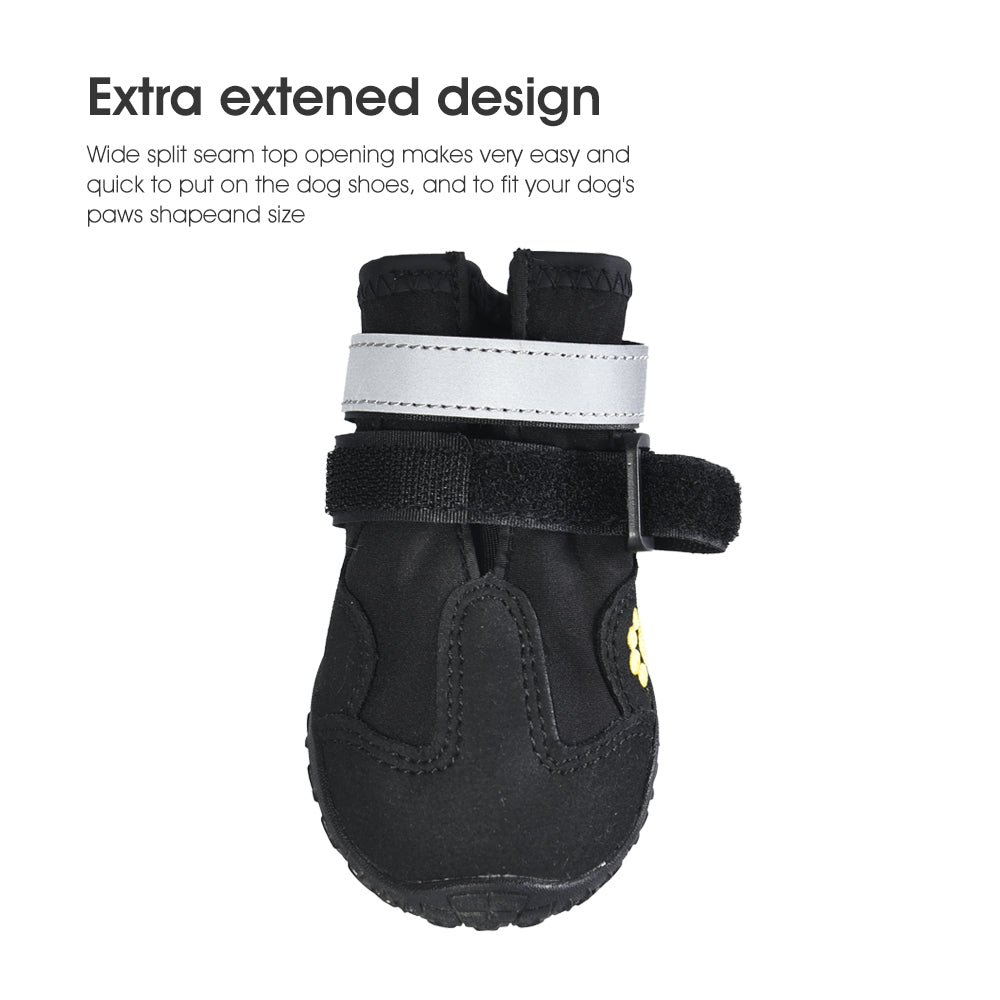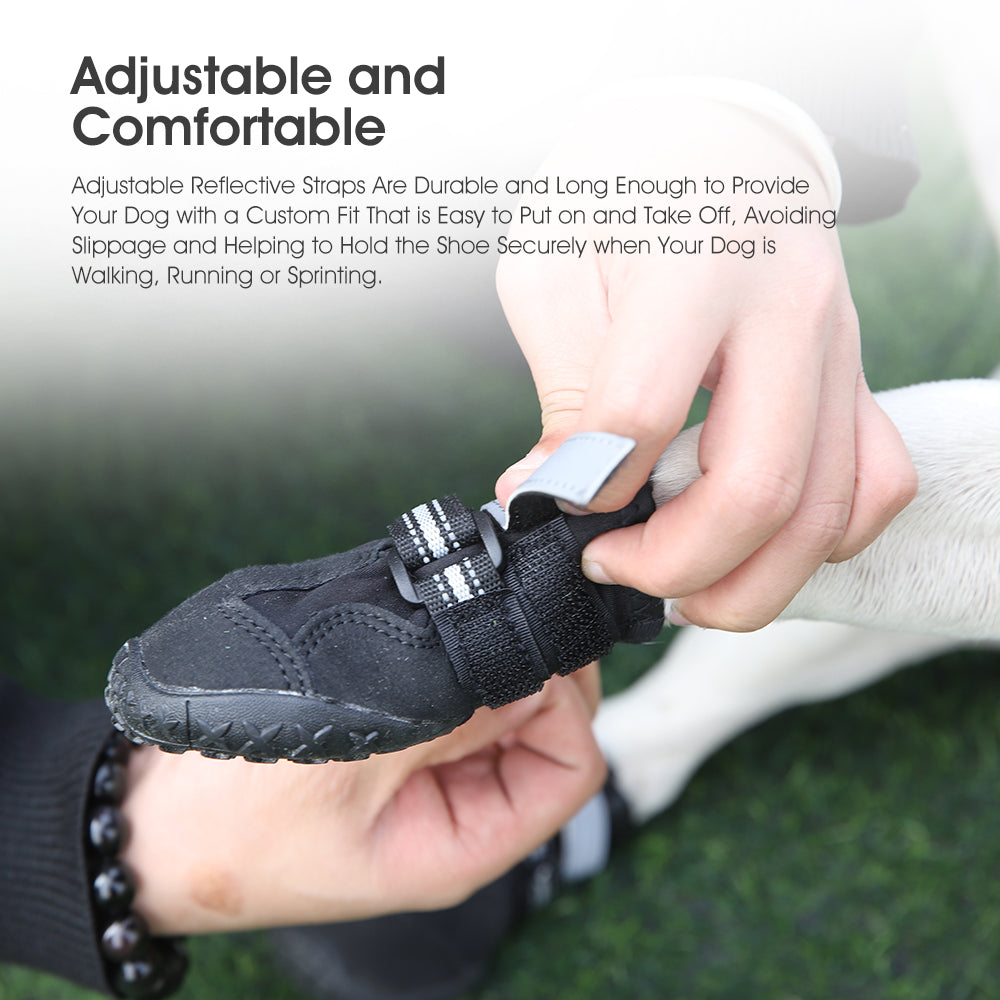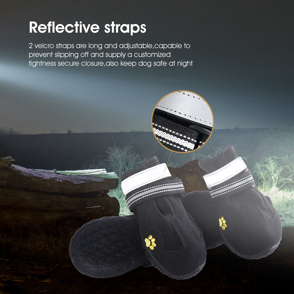 • SECURE AND ADJUSTABLE: Easy to put on / off. These dog shoes expand with a wide split seam opening and two adjustable and reflective straps to ensure a tight fit, also make your dog safe at night