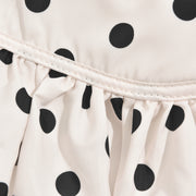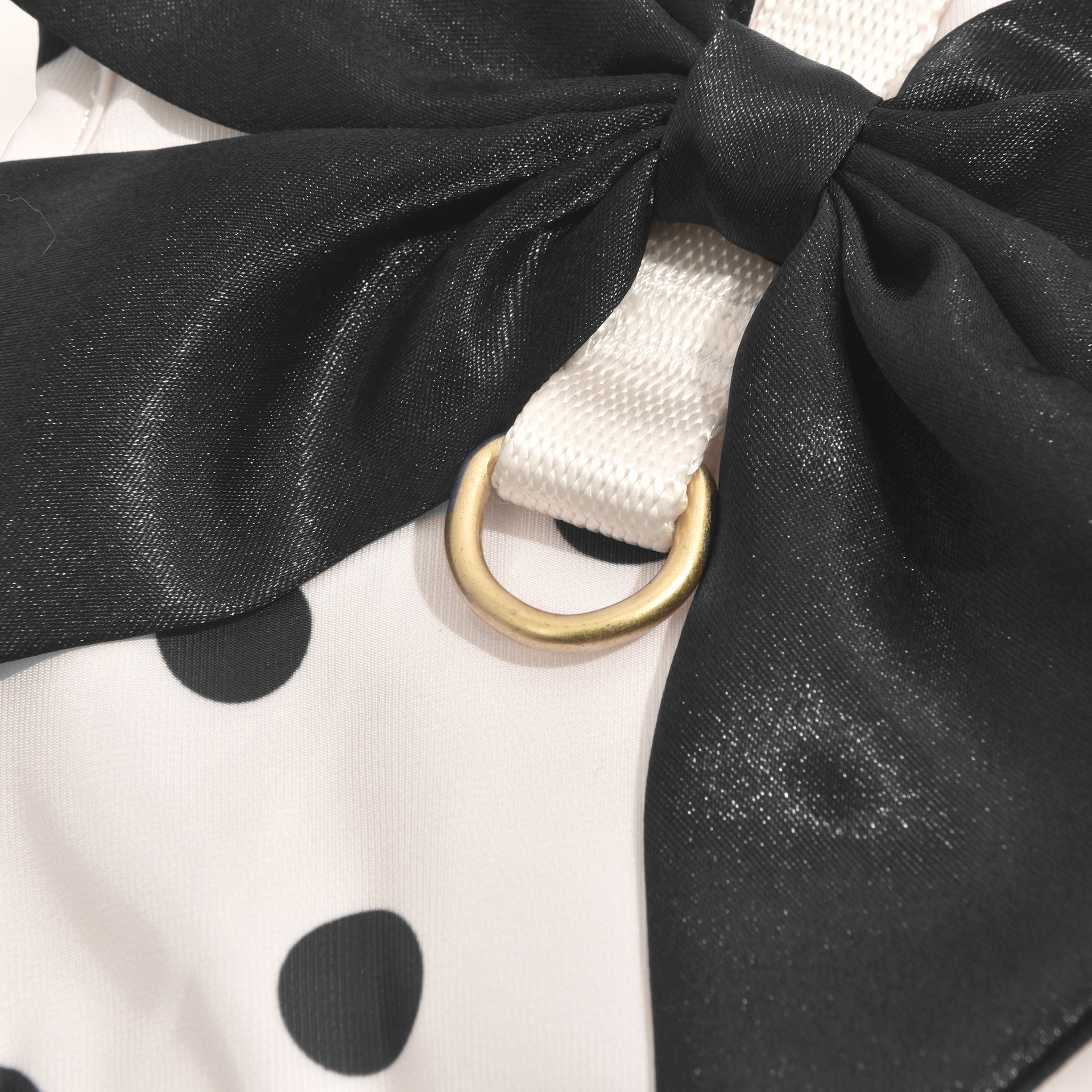 Polka dots never go out of style. The white and black polka dot pattern ruffled hemline and black bowknot make your dog the most remarkable baby on the street.