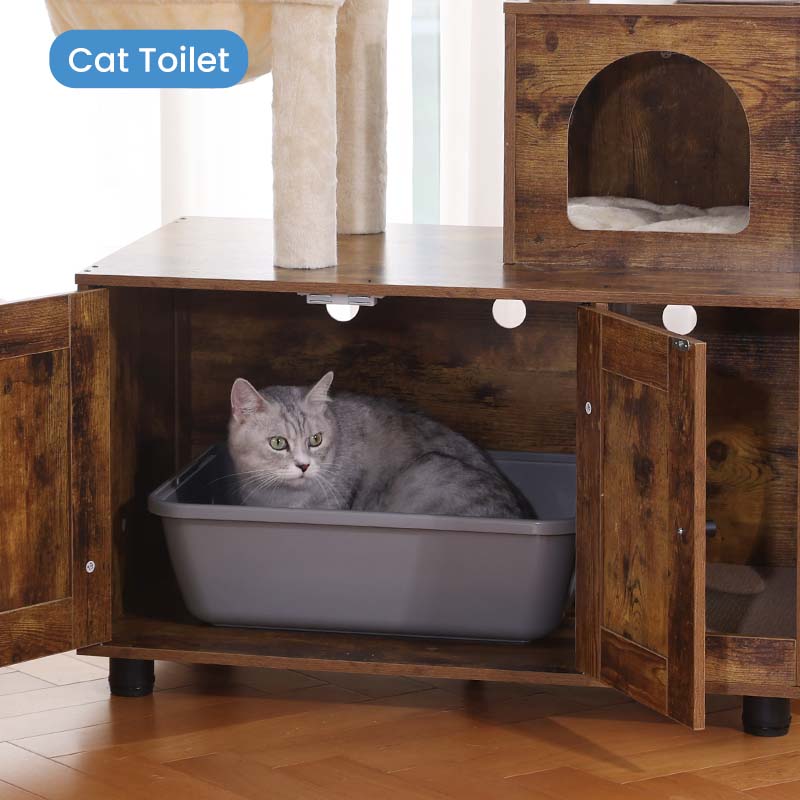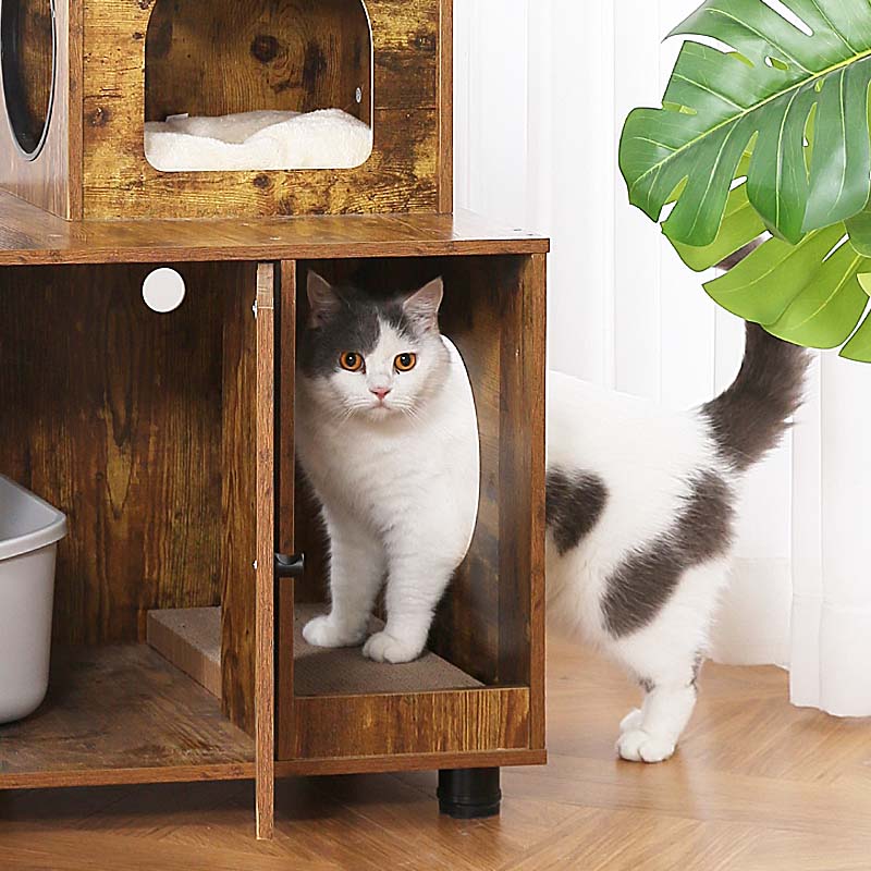 - It serves as a cat tree, a litter box enclosure, a cat/dog house, a side table, and a storage cabinet for your home.