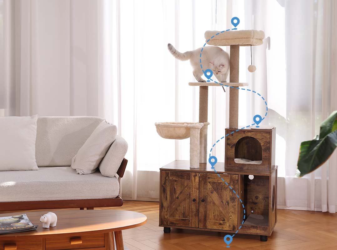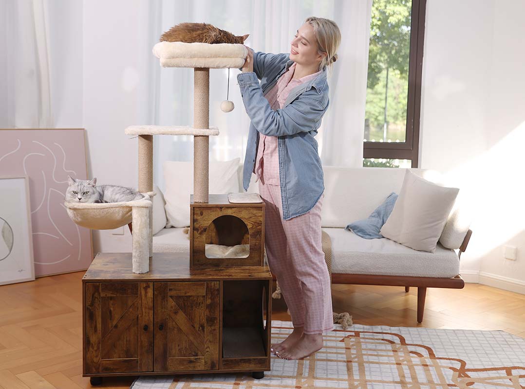 The Perfect Combination of Cat Tree, Sleeping Hammock, Play Toy and Litter Box Enclosure