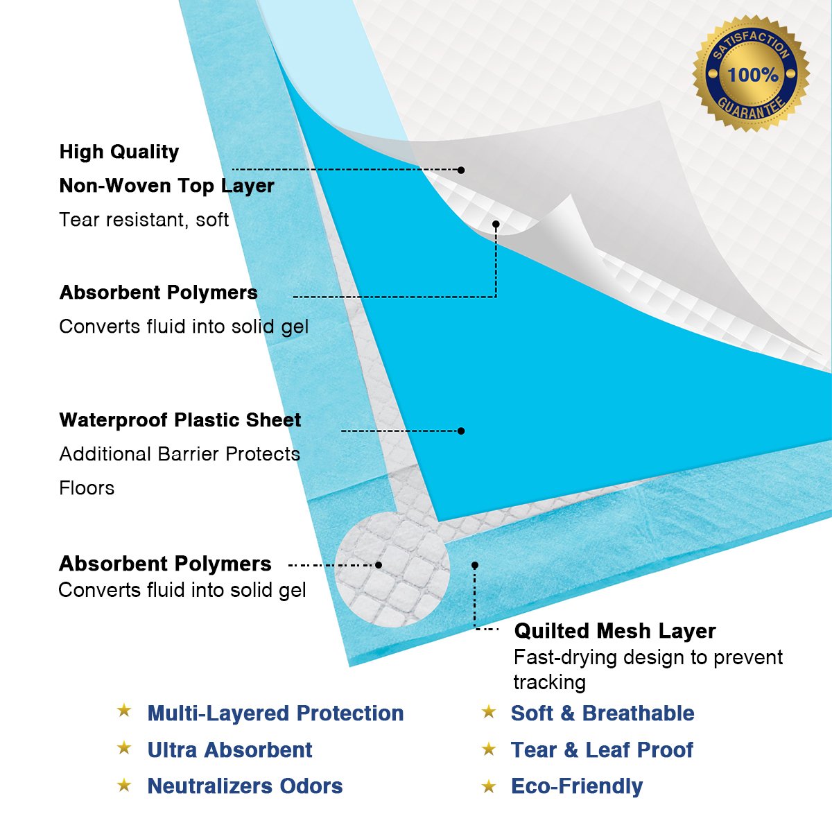 - Including a tear resistant quilted top layer, two absorbent polymers, a waterproof plastic sheet, and a quilted mesh layer.