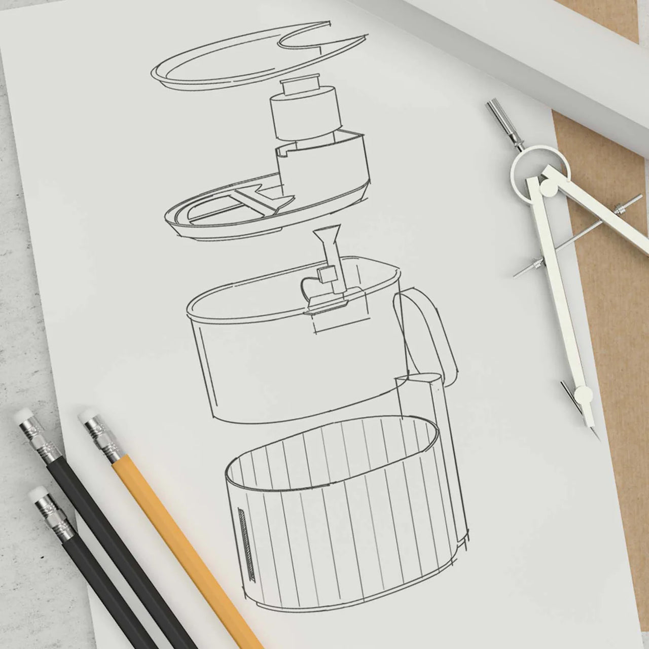 On the left is the design sketch of our bestselling product, Magic Clean Plus Pet Water Fountain. This illustration gives you a sneak peek into the meticulous planning and creativity that meets and exceeds your pet's needs.