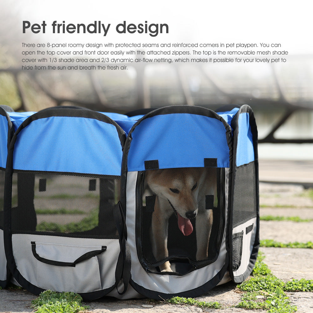 There are 8-panel roomy designs with protected seams and reinforced comers in pet playpen. You can open the top cover and front door easily with the attached zippers. The top is the removable mesh shade cover with 1/3 shade area and 2/3 dynamic air-flow netting, which makes it possible for your lovely pet to hide from the sun and breathe the fresh air.